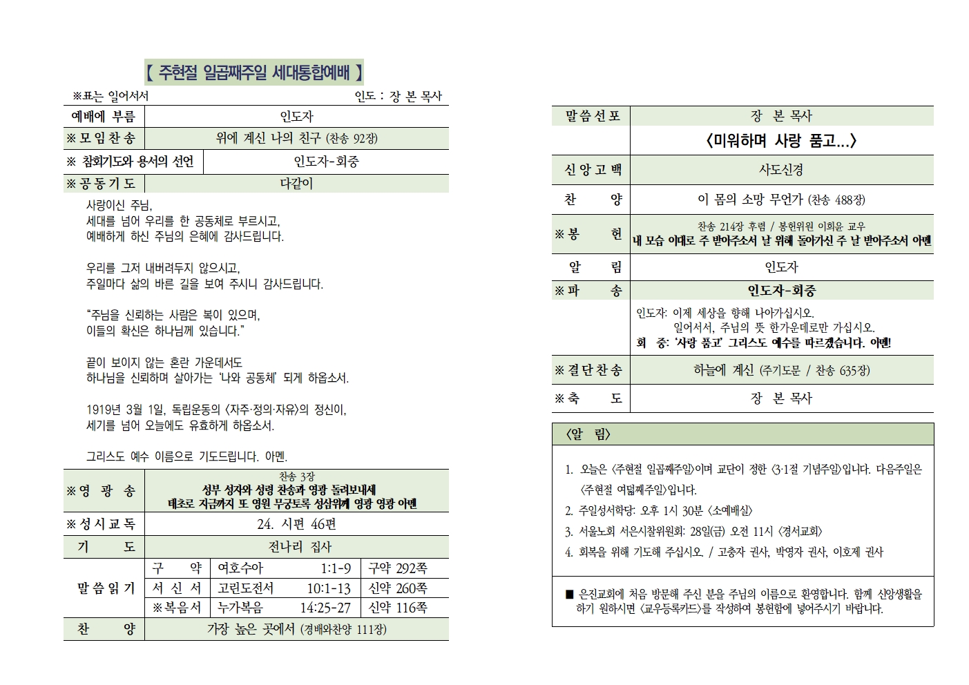 20250223 주현절 일곱째주일 / 3.1절 기념주일